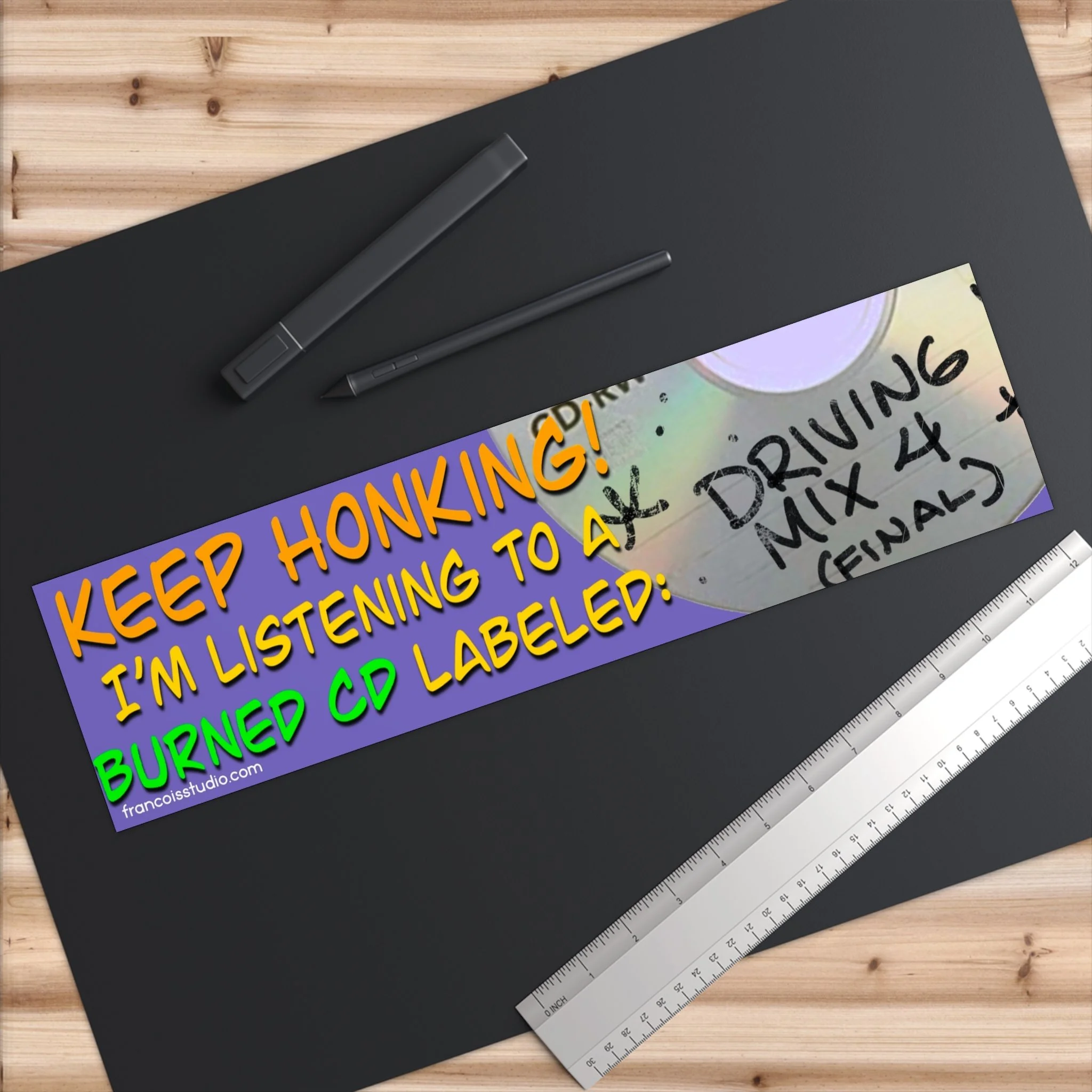 Bumper Sticker — “Keep Honking! I’m Listening to a Burned CD Labeled: Driving Mix 4 (Final)”