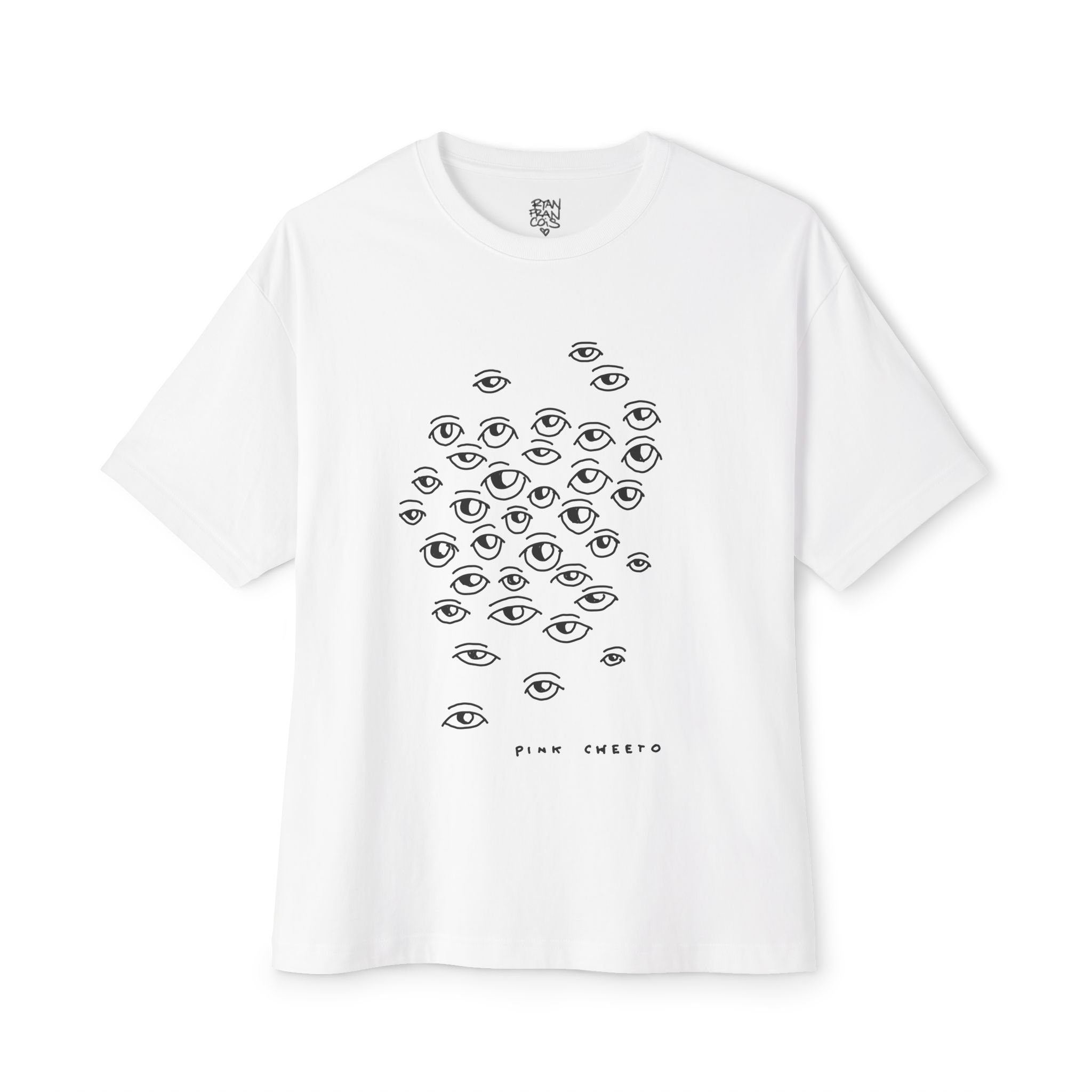 Ryan Francois's Pink Cheeto Art. A relaxed boxy tee that feels like a quiet statement. Lightweight yet substantial, the soft white cotton lays flat and drapes with a wide, dropped-shoulder silhouette. A minimalist cluster of hand-drawn eyes printed in delicate black lines sits on the chest — curious, contemplative, and slightly surreal. Wear it on slow mornings with jeans and a coffee, layered under an overshirt for city strolls, or at late-night gallery hangs where subtle details spark conversation. The understated graphic reads like a sketchbook page: thoughtful, a little mysterious, and calm in its simplicity.
