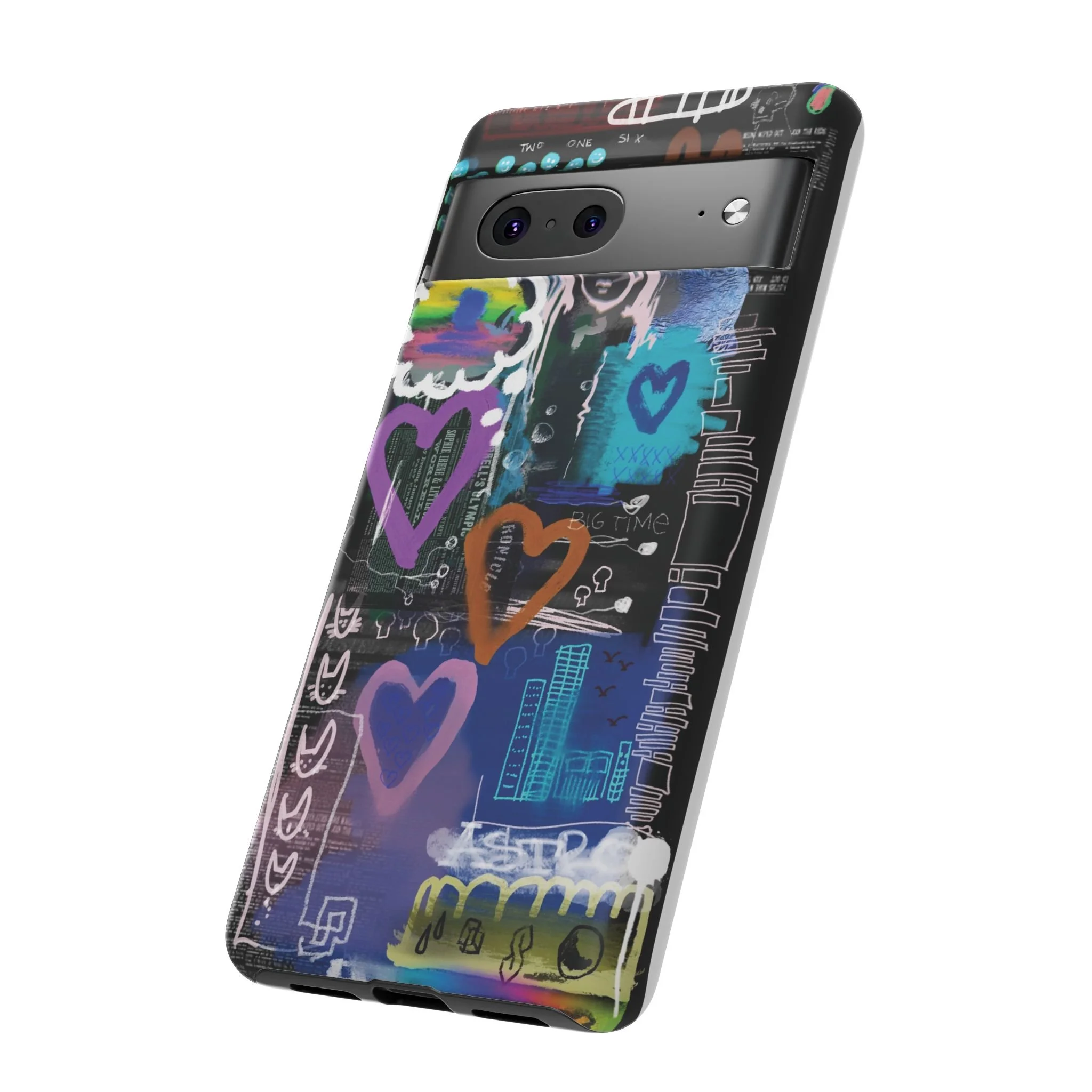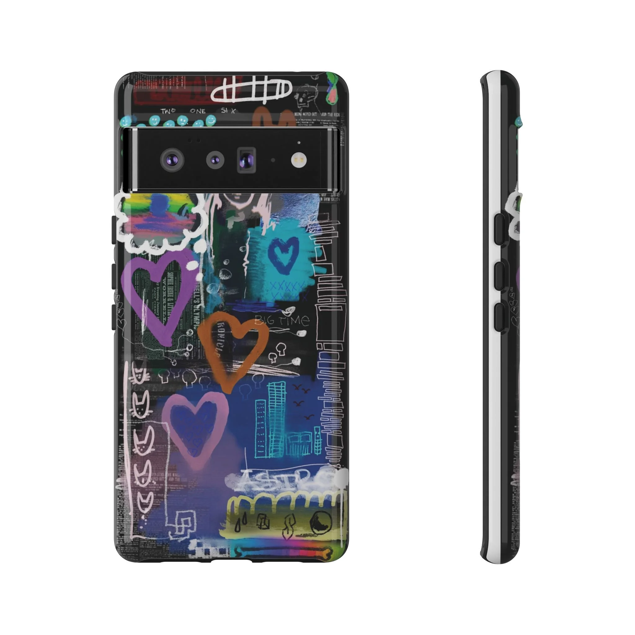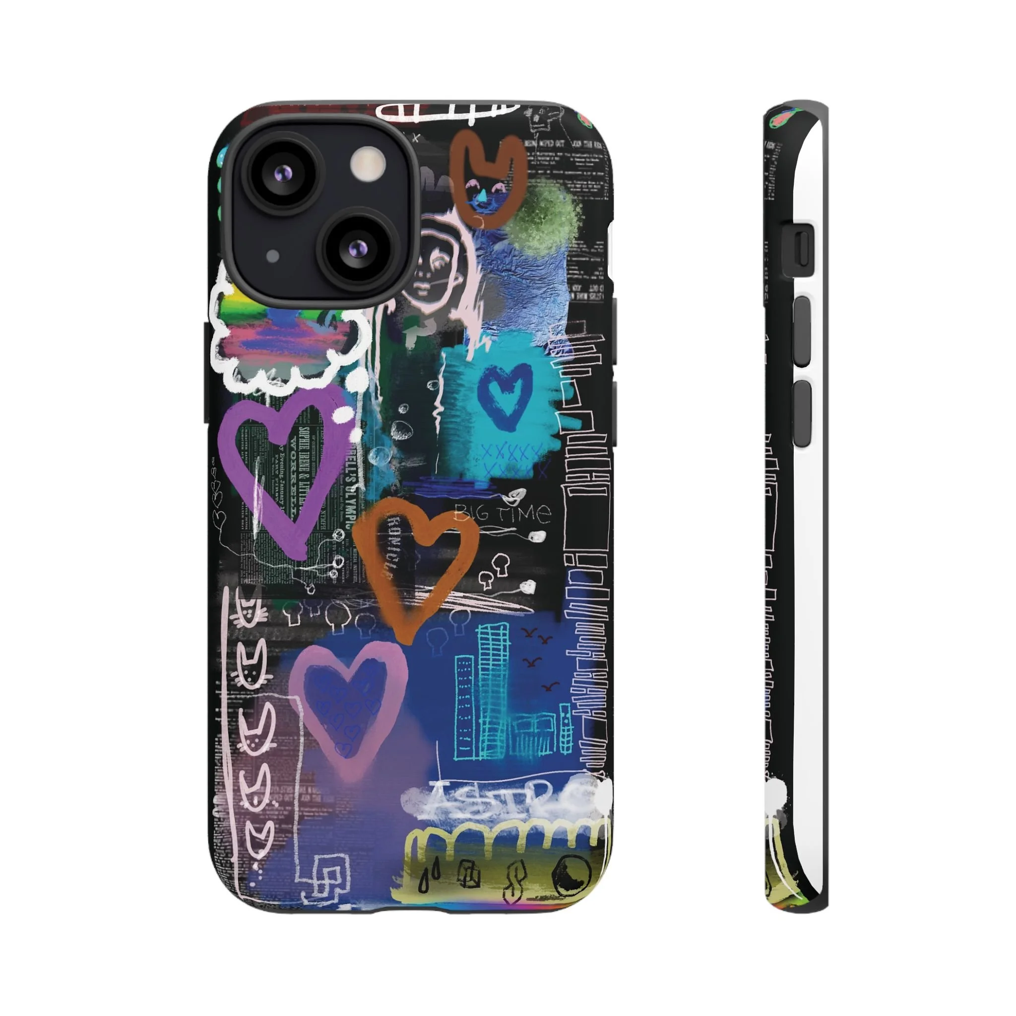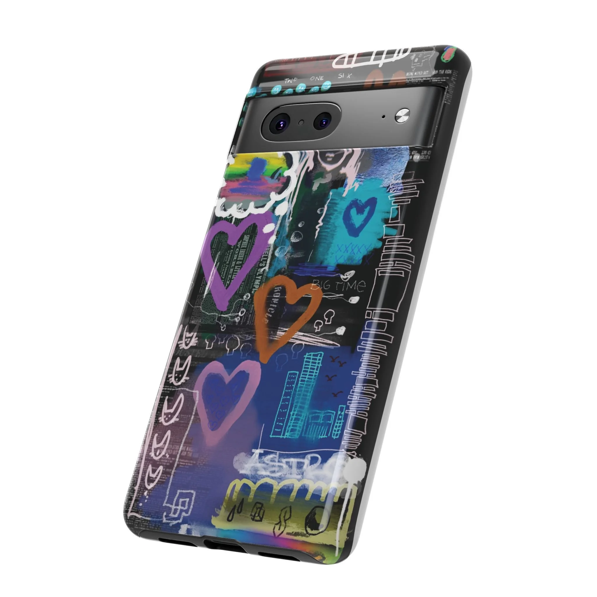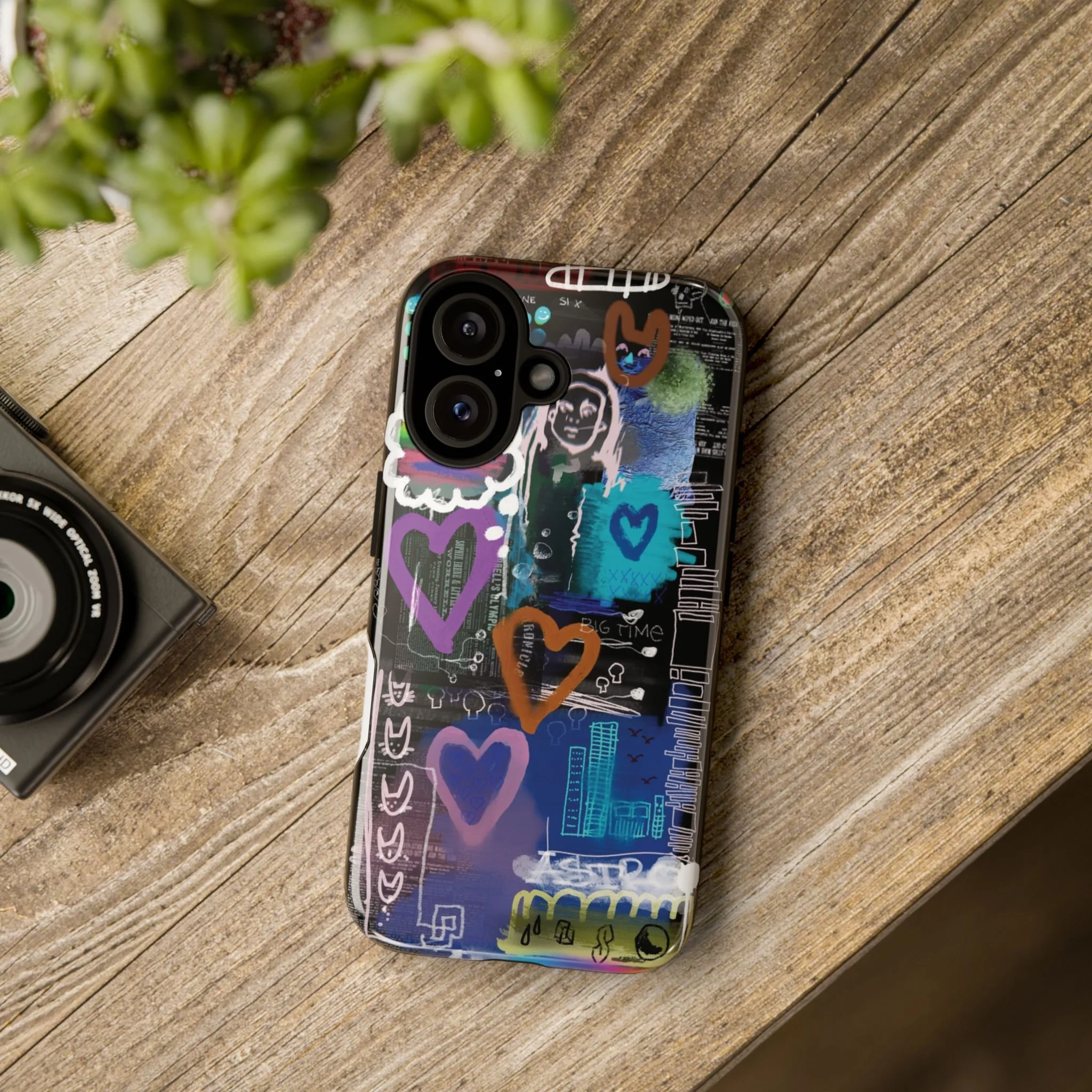 A protective Pink Cheeto phone case wrapped in vibrant street-art energy. Layers of spray-painted hearts, neon scribbles, and clipped architectural lines create a lived-in, gallery-on-the-go look. The glossy/matte finish keeps the colors saturated while the dual-layer polycarbonate shell and TPU silicone liner absorb shocks and guard against drops. Bring a bit of urban attitude to everyday carry — this case reads like a pocket sketchbook, brightening commutes, late-night walks, and coffee-shop sessions with its playful, hand-drawn charm.